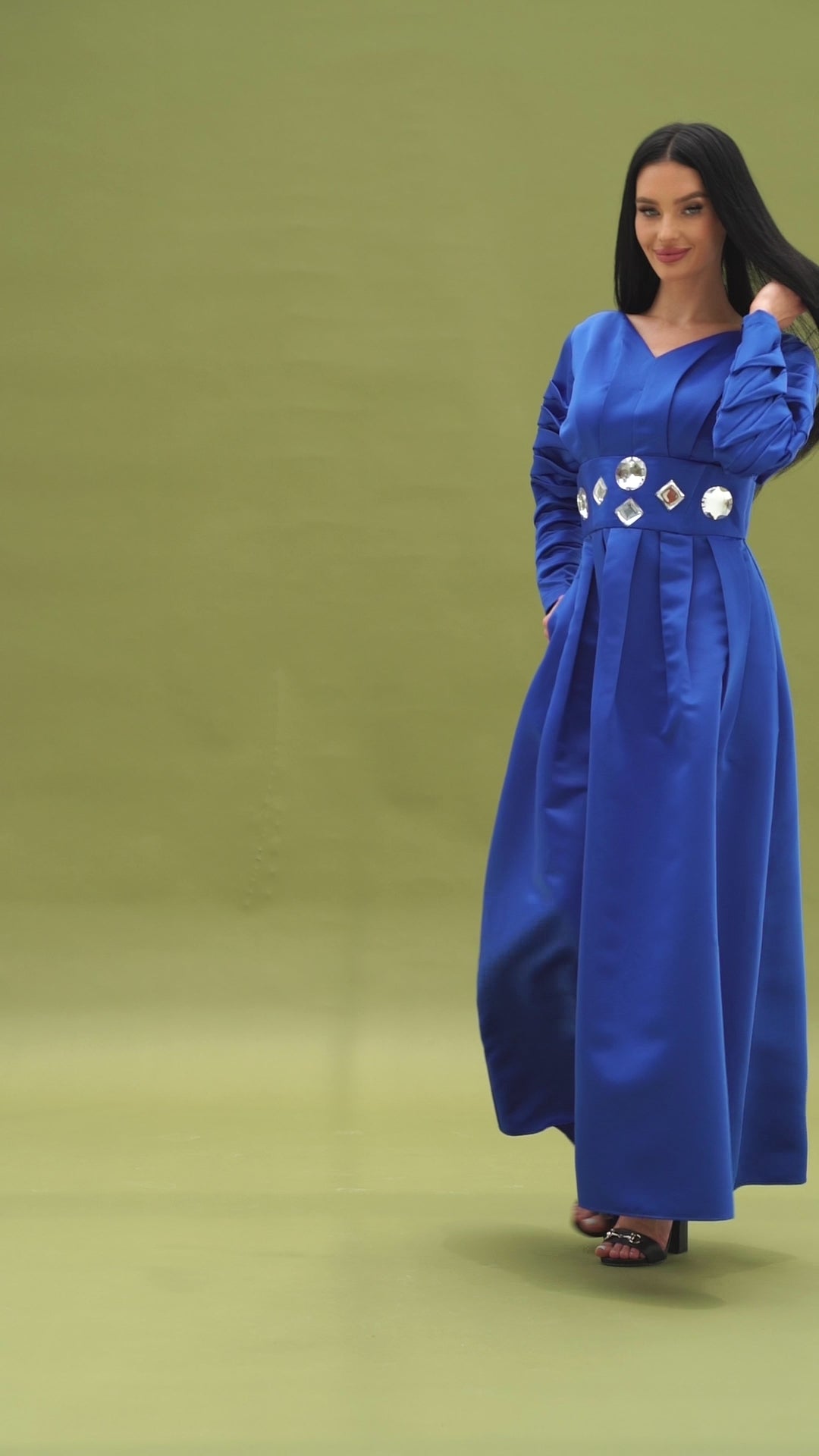 this elegant piece features a flattering V-neckline and long ruched sleeves that add a touch of sophistication. The cinched waist is adorned with eye-catching geometric embellishments, enhancing the gown’s regal appeal. The floor-length design flows beautifully, making it perfect for formal events, evening parties, or any special occasion. Pair it with your favorite heels and accessories to complete the look.