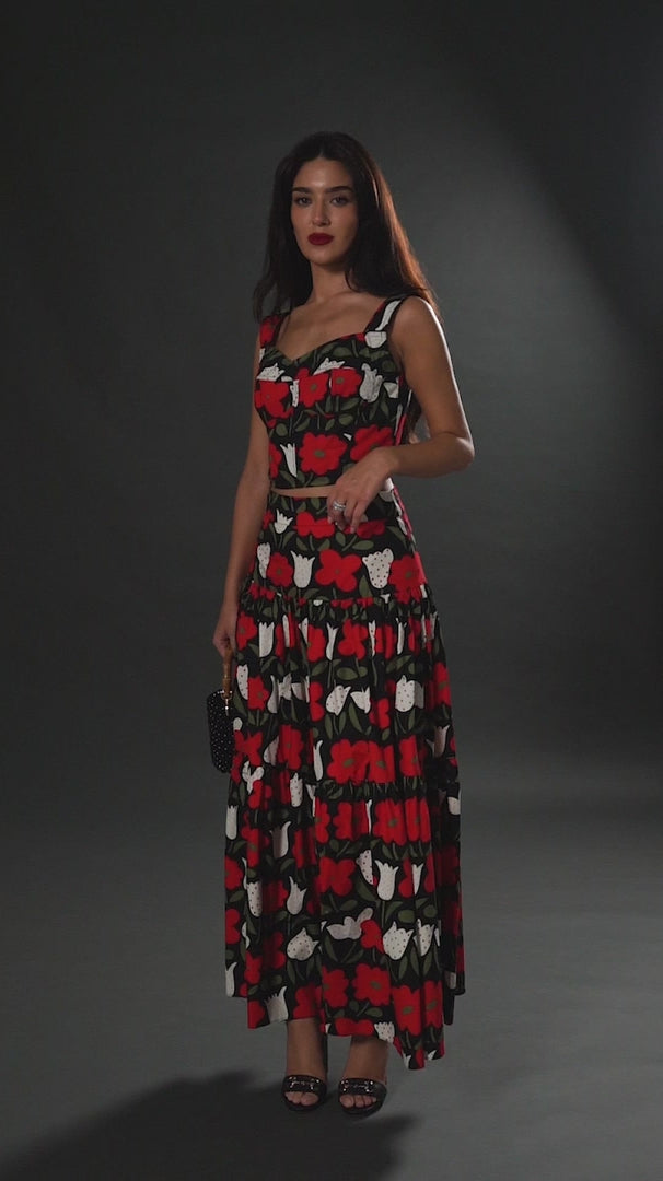 Radiating with vibrant red, black, and white florals, Baham captures the spirit of confidence and charm. This two-piece cotton poplin ensemble blends striking patterns with a timeless silhouette, creating a look that’s as unforgettable as it is elegant. Perfect for those who embrace life’s bold moments, Baham is your statement of chic sophistication.