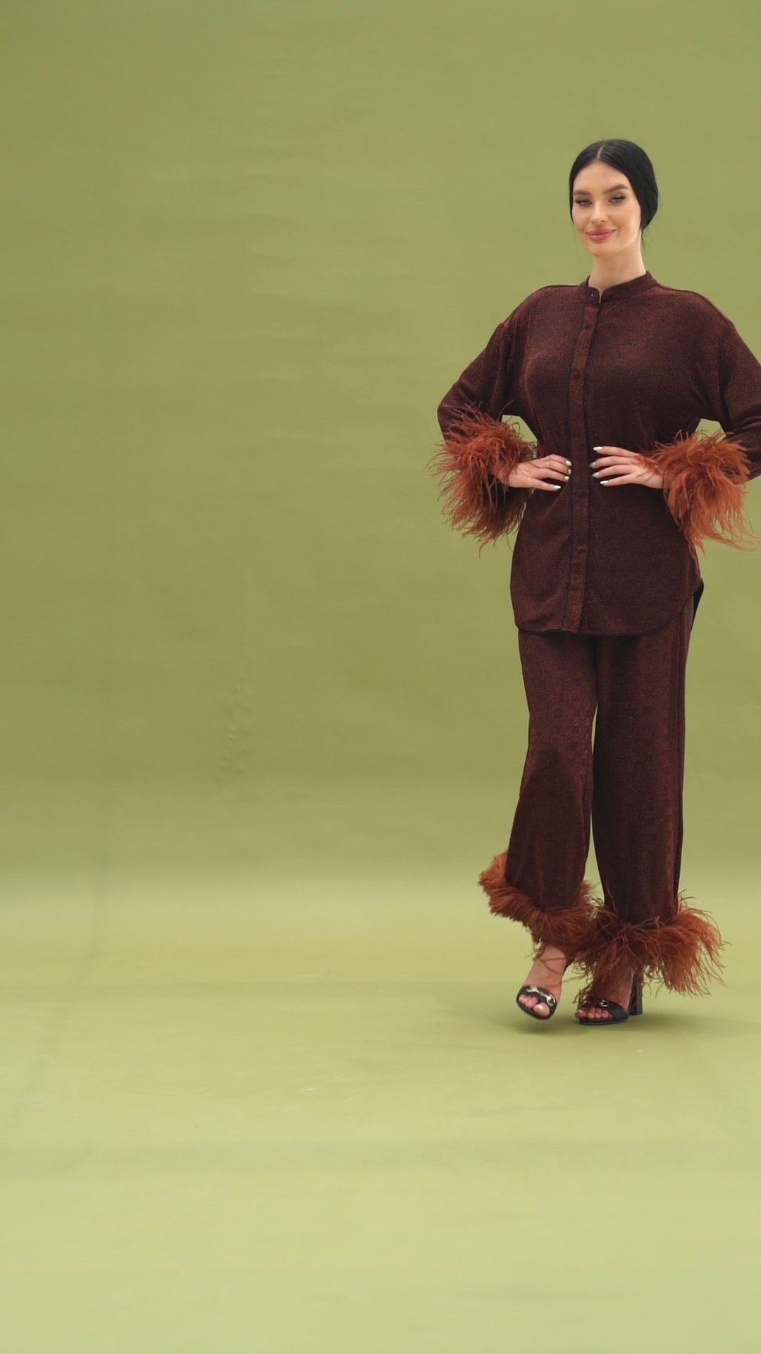 fabric, this set exudes elegance and comfort. The top features a chic mandarin collar and a classic button-down front, complemented by long sleeves adorned with striking brown feather trim at the cuffs. The matching wide-leg pants are also embellished with feather trim at the hem, creating a cohesive and sophisticated look. Perfect for enjoying a cozy night in, this set combines high fashion with ultimate