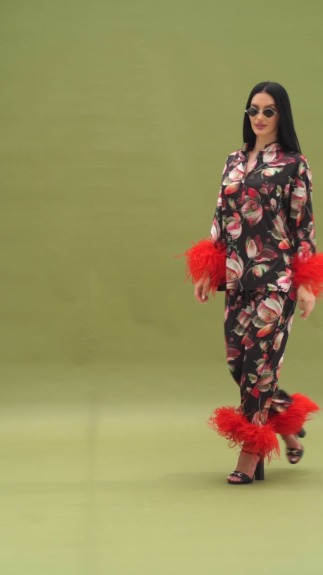 Make a bold statement in this captivating floral print set Blending playful, retro-inspired style with modern elegance, this ensemble is sure to turn heads. The set features a striking black base adorned with a vibrant floral print in shades of red, pink, and green. The dynamic pattern and color palette create a truly eye-catching design that exudes a free-spirited, bohemian-chic aesthetic. Adding to the visual drama are the luxurious feather trim accents at the cuffs and hem. These plush, vibrant red feathers lend an unexpected, theatrical touch that elevates the look beyond the ordinary
