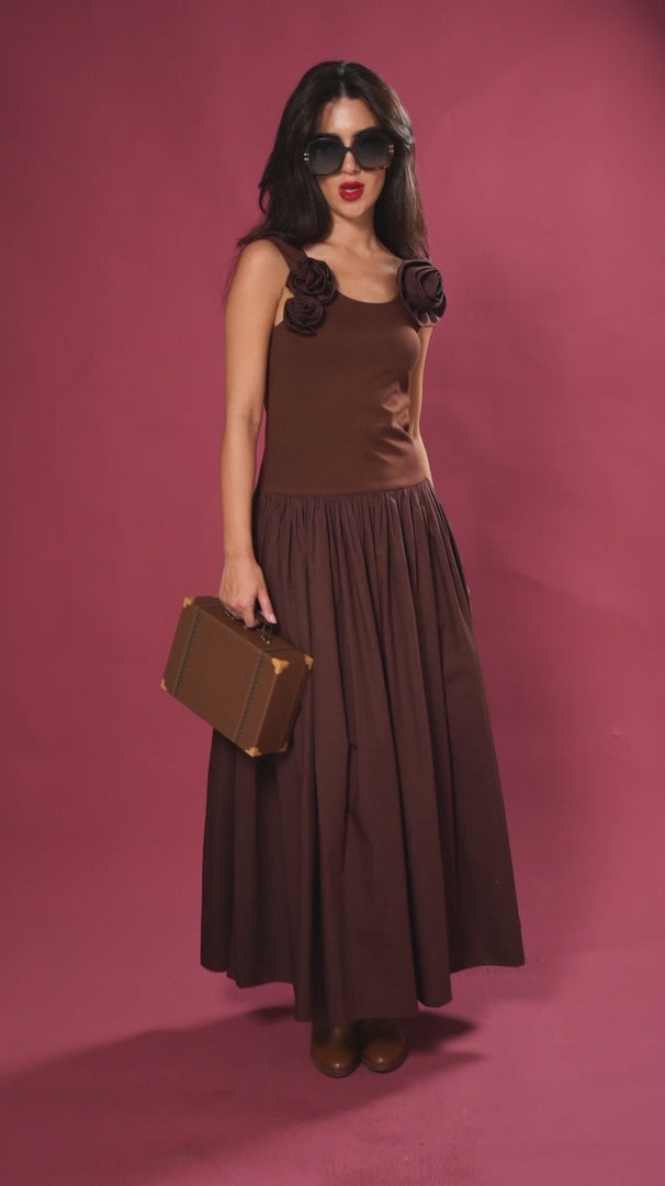 Sophisticated and earthy, Fornacis captures the essence of understated elegance in a rich brown hue. Crafted from soft jersey and cotton poplin, this dress flows effortlessly, blending comfort with refinement. The delicate shoulder detailing adds a unique touch, making Fornacis a perfect choice for those who seek elegance in simplicity and grace.