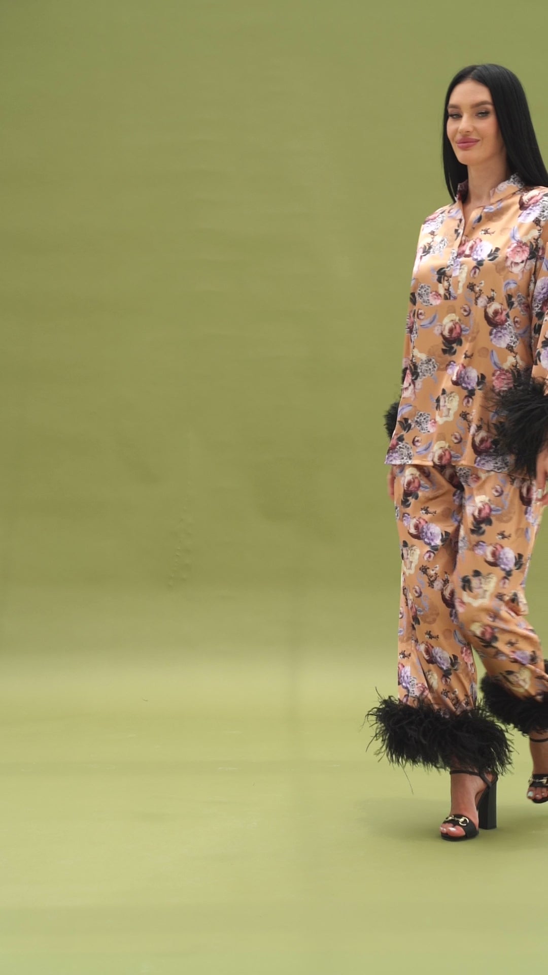 This striking gold floral set features a bold, eye-catching print that commands attention. The coordinating top and pants create a cohesive, stylish look. The added feathered trim adds a touch of high-fashion flair, elevating the ensemble.