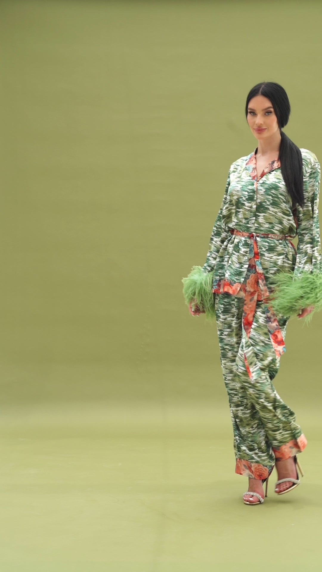 This vibrant, two-piece set exudes a bold, eye-catching aesthetic. The top features a striking abstract print in a mix of green camouflage and bright floral patterns, complemented by the dramatic feathered cuffs that add a touch of high-fashion flair. The matching wide-leg pants continue the dynamic, statement-making pattern, creating a cohesive, visually captivating ensemble. The combination of the vivid print, sculptural silhouette, and luxurious feather trim elevates this set to a level of chic sophistication, making it an impactful choice for a special occasion or event where the wearer wants to make a bold, fashionable statement.