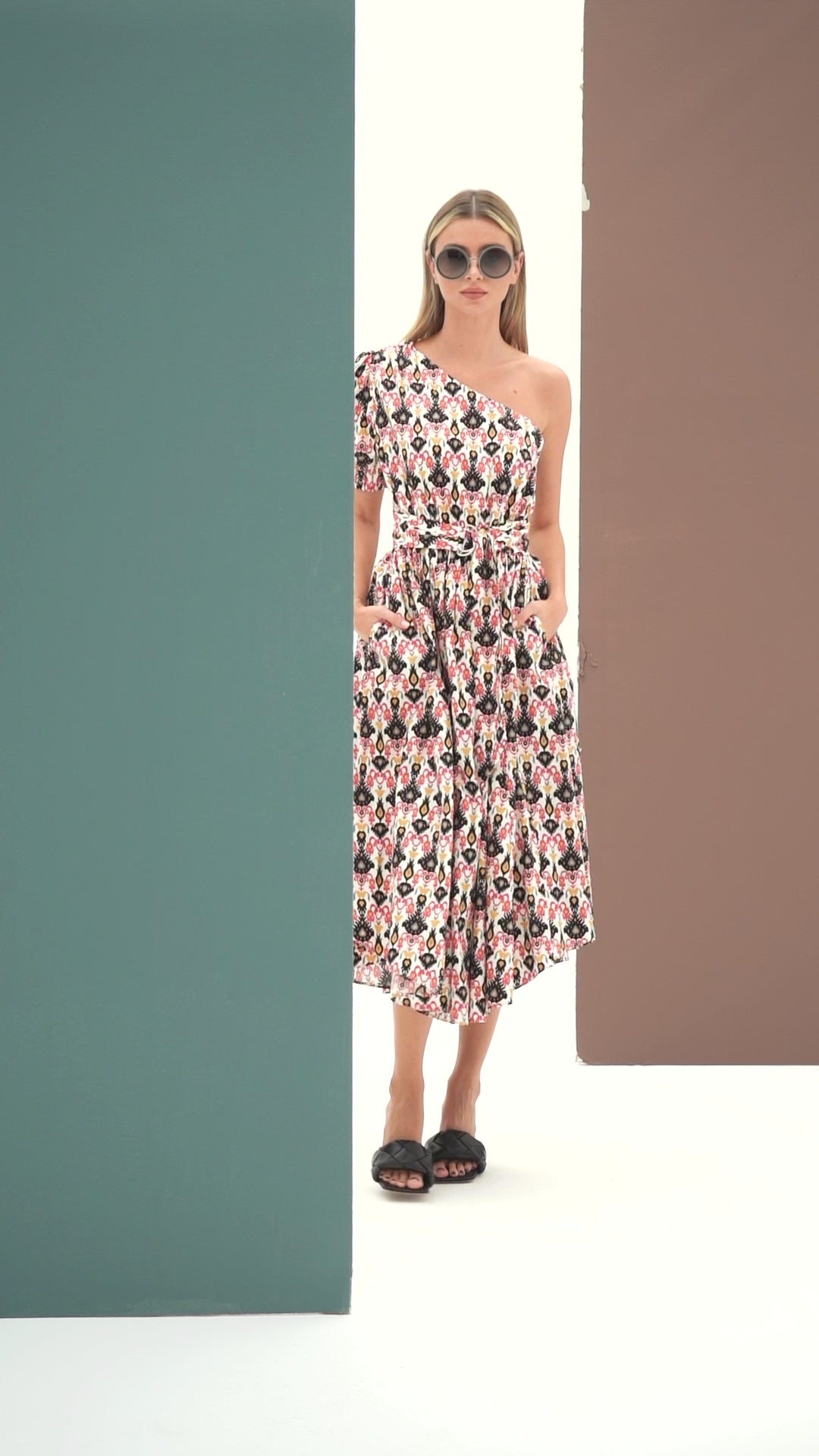 Introducing our one-shoulder multi-color dress. This stunning garment combines white, red, and black hues for a captivating look. It features a waist belt that shapes the waistline, creating a flattering silhouette. Made from high-quality materials, the dress offers both comfort and durability. Perfect for various occasions, this one-shoulder dress is sure to make a stylish statement.